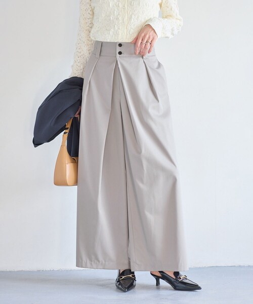 【2026 Spring】【26SS】 <POINT> ・フロントタックデザイン ・2個釦でポイント ・太ベルトデザイン ・ワイドシルエットで足長効果 【デザイン・シルエット】 腰回りはすっきり、下に広がるワイドデザインのデザインスラックス。カジュアルにもお仕事にも履いていただける色展開ときれい目の生地感で作りました。 フロントタックデザインと2つのボタンもポイント。 【素材】 上品な見た目と、柔らかさ、程よいハリ感のある素材感です。 【カラー】 ライトグレー、ベージュの2色展開。 【おすすめのスタイリング】 タックデザインのワイドシルエットなので、トップスはすっきりしたものと合わせるのがおすすめ! ハイウエスト気味に作っているので、ショート丈のカーディガンなどとの相性も◎ ----------------------------- 裏地:なし 光沢感:なし 透け感:なし 伸縮性:なし ウエスト:後ろ一部ゴム ファスナー:前にあり ポケット:あり ボタン:あり(開閉可) 生地の厚さ:普通 季節:春、秋 ----------------------------- 【モデル着用サイズ】 ベージュメイン身長:160cm 着用サイズ:M グレーメイン身長:161cm 着用サイズ:M 詳細モデル身長:168cm 着用サイズ:M ※画像の商品はサンプルです。 実際の商品と仕様、加工、サイズが若干異なる場合がございます。 ※画像によっては実際の色味と異なる場合があります。正しい色味は生地アップ画像をご確認ください。