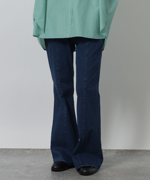 フレアシルエットのデニムパンツひざ下からのフレアシルエットは足先を綺麗に見せてくれる1本です。フロントとバックにデザインされたセンターシームが縦のラインを強調し視覚的な脚長効果も〇【素材】綿混の柔らかく肌馴染みしやすい素材感。【スタイリング】合わせるトップスを選ばずスタイリングできます。オールシーズンで活躍するのでワードローブにもおすすめ。