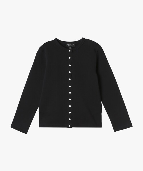 アニエスベー定番のカーディガンプレッション。 こちらはスリムタイプのデザインで、後ろ見頃の2つのスナップボタン付きタブがウエスト位置に配置されているのが特徴です。 裏起毛の暖かい素材で春秋はジャケットの様に、羽織ることができ、冬は、コートの中のミドラーとしても活躍します。 <アニエスベーのカーディガンプレッション> 1979年当時、アニエス・トゥルブレはよくスウェットシャツを着ていました。ある時ふと、昔登校中にボタンを留めていたカーディガンみたいに前が開いたらいいな、と思いました。そしてスナップボタンがルネッサンスの服や、神父服のように狭い間隔で並んでいるようデザインし、カーディガンプレッションが生まれました。 当初、カーディガンプレッションにはコットンのメルトン素材(裏起毛素材)が用いられ、直線的なカッティングに、丸襟で後ろに2つの調節用のタブがついていました。 その後、キッズとメンズラインでも展開。また、メルトン素材をレザーに変えたり、半袖にしたり、ビスチェにしたり、ウエストを絞ったりと、絶えず進化させ続けてきました。 カーディガンプレッションは、独自的で時代を超えて愛されるアニエスベーの定番アイテムです。 実寸情報 100~110cm(4歳) 肩幅:28cm/バスト:66cm/袖丈:33cm/身丈:36cm 110~120cm(6歳) 肩幅:30cm/バスト:68cm/袖丈:39cm/身丈:40cm 120~130cm(8歳) 肩幅:33cm/バスト:74cm/袖丈:42cm/身丈:44cm 130~140cm(10歳) 肩幅:34cm/バスト:76cm/袖丈:46cm/身丈:48cm 140~150cm(12歳) 肩幅:36cm/バスト:82cm/袖丈:50cm/身丈:52cm