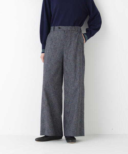 程よい凹凸感のあるツィードが上品なセミワイドパンツ 【デザインのポイント】 human woman定番のセミワイドパンツです。ウエストのボタンと後ろのフラップポケットがデザインポイントです。 【素材のポイント】 リング糸の程よい凹凸感とメランジ見えが上品なTRツィードを使用しています。ツィード見えながらもドライタッチでさらっとした清涼感のあるタッチに仕上げています。 【おすすめコーディネート】 同素材のブルゾンとセットアップでの着用でオケージョンニーズにも対応可能なアイテムです。またニットでカジュアルダウンしたスタイリングもおすすめです。 【お買いものをよりお楽しみいただく為に】 ■商品のお気に入り登録 再入荷・残り1点・セールの通知を受け取ることができます。 ■ブランドのお気に入り登録 新商品・再入荷/タイムセールやクーポンなどの ブランドの情報を受け取ることができます。 ------------------------------------------- 【human woman】 1998年よりスタートした”フレンチトラッド”をベースにした大人な女性のためのカジュアルブランド。 素材や縫製にもこだわってつくられた上質な日常着は、長い時間大切にお使いいただけるようにお作りしています。 約20年の歴史の中で、「数年着続けても安心感があるお洋服」と多くの方に高いクオリティを認められてきました。 ベーシックなアイテムにさりげなく加えたトレンド感で、「私らしいカジュアルスタイル」を見つけてみませんか。 「カジュアルが好き」「少しだけトレンドも取り入れたい」 「大切に着たい」「私らしくいたい」そんな思いをかなえるお洋服をhuman womanでは提案しています。 -------------------------------------------
