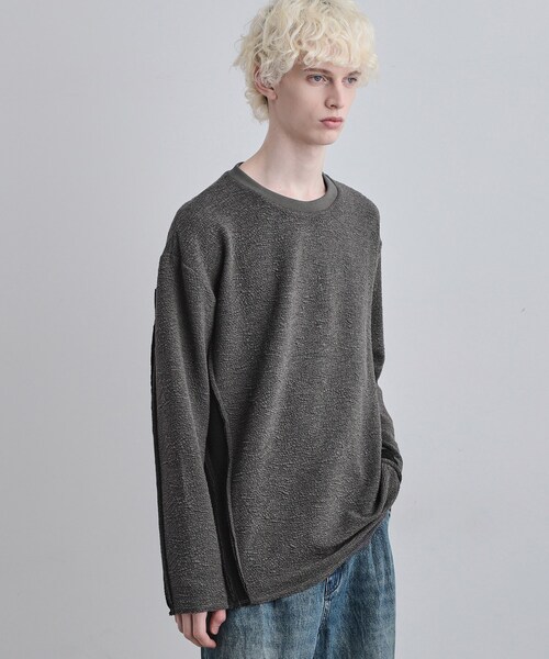 【素材】 表と裏の生地を部分的に繋ぎ合わせた、立体的な凹凸感が特徴のランダムフクレジャカード素材を使用しています。 ポリエステルとレーヨンをベースにした、滑らかな肌触りと美しい落ち感が魅力。 ポリウレタンを混紡することで、快適な伸縮性も加えています。 【デザイン】 2000年代初頭のアルチザン(職人)的なムードを現代的に解釈した、デザイン性の高いクルーネックプルオーバー。 生地の表裏を大胆に切り替え、さらにその縫い代を表に出す(アウトシーム)ことで、クラフト感のある独創的な表情を生み出しています。 サイドにあしらったジップがデザインのアクセントになっており、開閉することでスリットのように着こなしのアレンジをお楽しみいただけます。 肩幅や身幅にゆとりを持たせたリラックスシルエット。 長めに設定した袖丈は、アウターの袖口から覗かせてレイヤードスタイルをお楽しみいただけます。 着丈はやや長めですが、裾をラウンドさせることで、一枚で着てもバランス良く見えるよう計算されています。 コーディネートの主役になる、存在感のある一着です。 【推奨サイズ】 02サイズ(M):165~175cm 03サイズ(L):170~180cm ※標準体型を基にした目安になります。 - BRAND CONCEPT - 時代を超えて支持されるトラディショナルなアイテムをベースに、アソビ心とストリートの自由な発想を取り入れ、日本独自のミックススタイルを提案します。 【気になる商品はお気に入り登録をおススメ】 ▼商品のお気に入り登録 完売しているカラーの再入荷通知や、ラスト1点、セールの通知をお知らせいたします。 ▼ブランドのお気に入り登録 新商品や再入荷など、いち早くブランドの情報を受け取ることができます。 ※照明の関係により、実際よりも色味が違って見える場合があります。また、パソコン・スマートフォンなどの環境により、若干製品と画像のカラーが異なる場合もございます。 モデル情報:身長183cm B81 W68 H86 着用サイズ:03(L) 店舗へのお問い合わせ商品番号:170-35111 ●製品寸法: 02(M):着丈70cm B120cm 袖丈58cm 肩幅54cm 03(L):着丈72cm B124cm 袖丈59cm 肩幅56cm 備考: