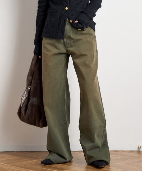 ミリタリーパンツを穿きこんだような風合いが魅力のパンツ。 25AWコレクションから登場したNEWモデルのD'ARCY LOOSE JEAN。タフな表面感でありながら、ストレートシルエットで足のラインを綺麗に見せてくれます。 日本製のセルビッチツイルを使用した、12オンスで軽い穿き心地も魅力。 【R13/アールサーティーン】 2009年にスタートしたニューヨーク発のデニムブランド。 アメリカンロックからインスピレーションを受け、アバンギャルドなシルエットを意識したコレクションやヴィンテージロックなデザインのデニムを中心に展開しています。 ※照明の関係により、実際よりも色味が違って見える場合があります。 またパソコン・スマートフォンなどの環境により、若干製品と画像のカラーが異なる場合もございます。 ※商品の色味は、商品アップ画像をご参照ください。 ※メーカー型番:R13WD038-D171C ※カラーについて 弊社販売カラー名:メーカーカラー名 カーキ(036):VINTAGE OLIVE SELVED ※サイズについて 弊社販売サイズ名:メーカーサイズ名 24(024):24 25(025):25 26(026):26 モデルサイズ:身長:162cm 着用サイズ:25 本体:洗濯機洗い(弱)