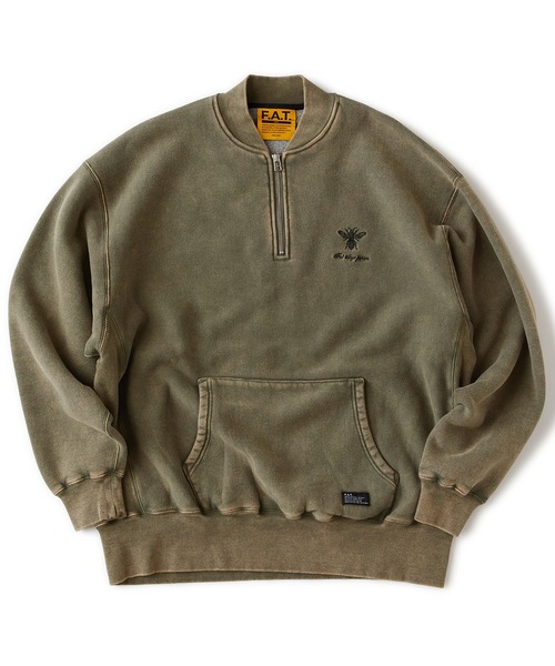 絶妙な色合いとアタリ感が印象的なケミカル加工を施したハーフジップスウェット。カンガルーポケットを備えたオーセンティックなスタイルとシンプルな衿デザインは、1枚で着こなしても良し、アウターを羽織ってレイヤードスタイルも楽しめるアイテム。胸の刺繍とポケットのブランドネームが程よく主張してくれる。