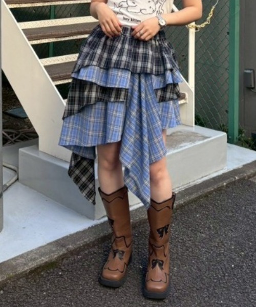 3種類のチェックを組み合わせたレイヤード風デザインのティアードスカート。 動くたびに揺れるイレギュラーヘムシルエットがコーディネートに抜け感をプラスします。 ウエストはゴム仕様でストレスフリーな穿き心地。 短すぎない丈感で1枚ではもちろん、 下にダメージデニムなどのボトムを組み合わせたレイヤードスタイルもオススメ。 シーズンレスで活躍するアイテムです。 ・ ・・・・・・・・・ ・・・・・・・・ ・透け感:なし ・伸縮性:なし ・生地の厚さ:普通 ・裏地:なし ・ポケット: なし ・ ・・・・・・・・・ ・・・・・・・・ ・オフホワイト/白、ボルドー、ネイビーの3色展開 #カジュアル#ガーリー#チェック#キャンスト#キャンスパ#CND ●Candy Stripper/キャンディストリッパー● -BRAND CONCEPT- NO RULE, NO GENRE, NO AGE 年齢や性別にとらわれず、自由に自分を表現出来る服 【お買い物をもっとお楽しみ頂くために】 ▼商品のお気に入り登録▼完売カラーの再入荷通知や、ラスト1点通知、 プライスダウンしたセール通知も受け取れる♪ ▼ブランドのお気に入り登録▼ 新作や再入荷等、いち早くブランドのお得な情報が受け取れる♪