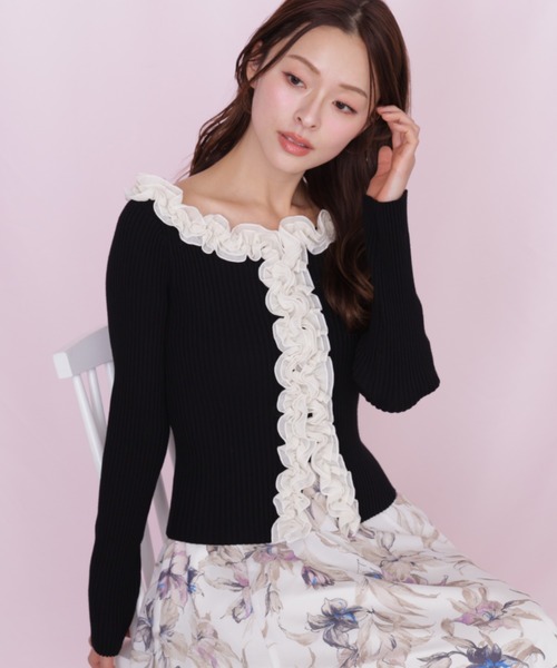 衿ぐりと前立てにシフォンのボリュームフリルをトリミングした華やかなニット細身でほど良くフィットするリブニットと布帛フリルのコントラストがポイント。ほど良いデコルテ開きで首元をキレイに見せつつ、フリルにボリュームがあるので肩紐を気にしないで着られます。バイカラーの配色ブラックと、同色系でまとめたエクリュとピンクカラーも華やかで春のコーディネートにおすすめです。※撮影時照明の関係により、色味が違って見える場合がございます。またパソコン・スマートフォンなどの環境により、若干製品と画像のカラーが異なる場合もございます。予めご了承ください。商品の色味は、商品単品画像をご参照下さい。※商品画像はサンプルのため、色味やサイズ等の仕様に変更がある場合がございますので、予めご了承ください。◆お買い物をよりお楽しみいただくために◆・「商品のお気に入り登録」で完売カラーの再入荷やラスト1点、セール通知を受け取ることができます。・「ブランドのお気に入り登録」で新商品の入荷情報など、いち早く受け取ることができます。