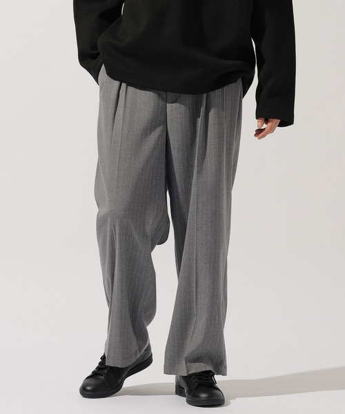 着回し力抜群トレンドコーデにぴったりなワイドパンツ【デザイン】やや控えめなアクセントを添えるピンストライプをあしらったワイドパンツ。ツータック入れることで上品な印象とゆとりのある穿き心地に。カジュアル、ワーク、トラッドなど幅広い系統にマッチする汎用性の高い一本です。【素材】レーヨン混のポリエステルを使用した、軽やかで落ち感のきれいな素材感。程よい厚みなのでロングシーズンお使いいただけます。【シルエット】裾先に向かってストンと落ちるゆったりとしたワイドシルエット。【コーディネート】ニットやテーラードジャケット、ロングコートを合わせた都会的なベーシックスタイル。足元は革靴で引き締めると大人らしい雰囲気を演出できます。フィットサイズの無地スウェットと合わせてトレンドのノームコアスタイルに。足元はスニーカーで軽快に、キャップやショルダーバッグなど合わせると◎▽おすすめの合わせアイテム▽ 品名:カットモールVネックプルオーバー品番:636895※屋外の光や照明の当たり具合で、実際の商品の色味とカラー別画像の色味に違いが発生する場合がございます。商品の色味はスタジオ撮影の詳細画像にてご確認ください。※商品の色や質感を出来るだけ忠実に再現するよう心掛けていますが、実物と若干異なる場合がございます。※取扱いアイテムは店舗により異なる場合がございます。