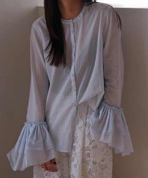 スタイリングを華やかに格上げするティアードスリーブが魅力のコットンブラウス軽やかなコットン素材を使用したデザインシャツ。ランダムに生地を重ねたスリーブにはたっぷりと生地を使用し、動きと華やかさをプラスします。スタンドカラーにすることで顔回りをすっきりと見せてくれるのも魅力の一つです。一枚ではもちろん、ニットやスウェットから袖をのぞかせたレイヤードスタイルもおすすめ。春の装いにニュアンスを添える一アイテムです。デートや女子会などのシーンにおすすめの着映えする一枚。---------------------------------透け感:あり裏地:なし伸縮性:なし光沢感:なし生地の厚さ:薄め---------------------------------▼お取り扱い上の注意※お手入れの際は商品の縫込みネーム・アテンションを必ずご確認ください。家庭洗濯〇(40℃限度。手洗いのみ)漂白×タンブル乾燥×日陰でのぬれ平干しアイロン〇(中温150℃まで)ドライクリーニング〇(弱い処理。石油系溶剤)ウェットクリーニング〇(非常に弱い処理)・ネット使用、もしくは裏返ししてお洗い下さい。・素材の性質上、多少収縮する可能性があります。洗濯後、形を整えて干して下さい。なお自動乾燥機(タンブラー)の御使用はおさけ下さい。・アイロンは裏側からあてて下さい。・アイロン時はあて布をして下さい。・この製品は、洗濯の際、多少の色落ちします。他のものと別に洗って下さい。この製品はデリケートな素材を使用しておりますので、ご使用の際は以下の点にご注意下さい。・表面の粗いものに擦ったり、先の鋭い物に引っ掛けますと、ささくれや糸が浮き易く、切れることも有ります。着脱時や着用時にはベルト・バック・アクセサリー・周囲の壁など表面の粗いものとの摩擦や引っかかりにご注意下さい。・強く引っ張りますと糸の滑脱、糸切れの原因になりますので、ご使用の際は強く引っ張らないよう、ご注意下さい。この製品は素材感と雰囲気を重視し、ぜいたくなオシャレ感覚を表現するために、非常に柔らかい風合いの生地を使用しております。激しい運動や強度な力が加われば縫い目が開いたり、目寄れ(織り糸が滑り目が開く)する性質をもっています。この点をご留意の上、ご着用下さい。