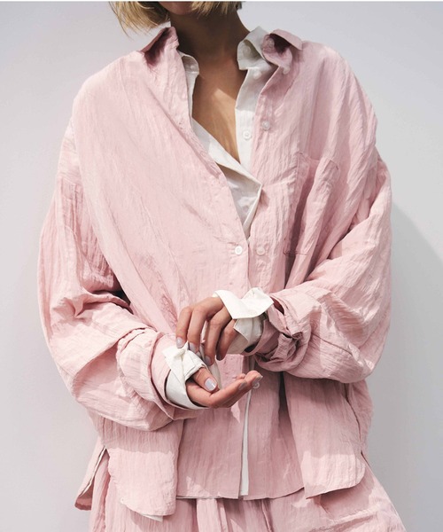 表情のある素材が着るだけでこなれ感漂う、エフォートレスなオーバーシャツ軽やかでしなやかな素材にシワ加工を施した、表面感のあるオーバーシャツ。ゆったりとしたサイズ感と長めの袖が、抜け感のあるシルエットを作ります。やや光沢のある生地が上品さもプラス。幅広いボトムスと合わせやすいシンプルなデザインで、バターイエローとベビーピンクは同素材のボリュームクリンクルワイドパンツとセットアップでの着用もおすすめです。春らしい柔らかなカラーと風合いを楽しめる一枚。通勤、通学はもちろん、デートや旅行、テーマパークなどのお出かけコーデにおすすめ。---------------------------------透け感:あり裏地:なし伸縮性:なし光沢感:ややあり生地の厚さ:やや薄め---------------------------------▼お取り扱い上の注意※お手入れの際は商品の縫込みネーム・アテンションを必ずご確認ください。家庭洗濯〇(40℃限度。手洗いのみ)漂白×タンブル乾燥×日陰でのぬれ平干しアイロン×ドライクリーニング〇(弱い処理。石油系溶剤)ウェットクリーニング〇(非常に弱い処理)・洗濯の際は、軽く押し洗いして下さい。・ネット使用、もしくは裏返ししてお洗い下さい。・この製品は、洗濯の際、多少の色落ちします。他のものと別に洗って下さい。・素材の性質上、多少収縮する可能性があります。洗濯後、形を整えて干して下さい。なお自動乾燥機(タンブラー)の御使用はおさけ下さい。この素材は摩擦(特に湿った状態での摩擦)や、汗や雨などでぬれた時は他の衣料や下着に色が移る事がありますので、ご注意下さい。〈洗濯時のご注意〉・洗濯の際、他の物と一緒に洗わないで下さい。・ぬれた状態で他の洗濯物と一緒に重ね合せないで下さい。・漂白剤及び漂白剤入りの洗剤のご使用はさけて下さい。この製品は物理的にシワ加工を施しています。永久的なものではなく着用やクリーニングをくり返すことにより、シワが消失してしまいます。次の点に十分ご留意の上、お取扱い下さい。・アイロン掛けは絶対にお避け下さい。・取扱い絵表示をご確認の上、クリーニングに出される際はシワ加工製品であることを、クリーニング店にお申し出下さい。