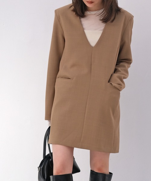 大人が着たいシックでモードなミニワンピース ハリがありながら、しなやかな素材がシルエットを美しく保ち、洗練された雰囲気を演出するミニワンピース。 肩のラインを直線的に見せる仕様を用い、モード感漂うシャープな印象に仕上げています。 深めのVネックデザインがすっきりと見せながら、合わせるインナーで表情を変えられるのも魅力の一つ。 大人に着こなせる短すぎないミニ丈でワンピースとしてはもちろん、パンツと合わせたレイヤードスタイルなど、幅広いコーディネートを楽しめるアイテムです。 デートや女子会などのシーンにおすすめの着映えする一枚。 --------------------------------- 透け感:なし 裏地:なし 伸縮性:なし 光沢感:なし 生地の厚さ:普通 --------------------------------- ▼お取り扱い上の注意 ※お手入れの際は商品の縫込みネーム・アテンションを必ずご確認ください。 家庭洗濯〇(40℃限度。手洗いのみ) 漂白× タンブル乾燥× 日陰でのぬれ平干し アイロン〇(低温110℃まで。スチームアイロン×) ドライクリーニング〇(弱い処理。石油系溶剤) ウェットクリーニング〇(弱い処理) ・洗濯の際は、軽く押し洗いして下さい。 ・ネット使用、もしくは裏返ししてお洗い下さい。 ・この製品は、洗濯の際、多少の色落ちします。他のものと別に洗って下さい。 ・素材の性質上、多少収縮する可能性があります。洗濯後、形を整えて干して下さい。なお自動乾燥機(タンブラー)の御使用はおさけ下さい。 ・アイロン時はあて布をして下さい。 この素材は摩擦(特に湿った状態での摩擦)や、汗や雨などでぬれた時は他の衣料や下着に色が移る事がありますので、ご注意下さい。 〈洗濯時のご注意〉 ・洗濯の際、他の物と一緒に洗わないで下さい。 ・ぬれた状態で他の洗濯物と一緒に重ね合せないで下さい。 ・漂白剤及び漂白剤入りの洗剤のご使用はさけて下さい。
