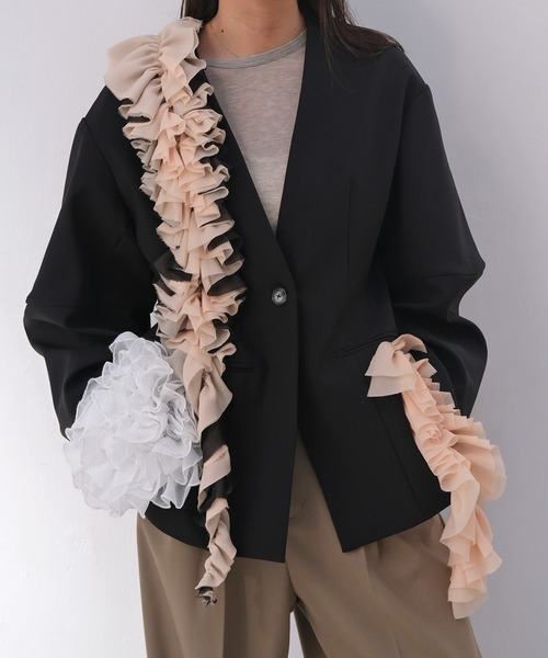 ふんだんにあしらわれたフリルデザインがスタイリングの主役を飾るコクーンスリーブジャケット シフォンの装飾が華やぎを与えるデザインジャケット。 シフォン生地を重ねてボリュームのあるフリルをたっぷり付けることで、表情が生まれ、シンプルなインナーに合わせるだけでも様になります。 コクーンスリーブが立体的に見せ、シェイプさせたウエストラインが、メリハリのある女性らしいシルエットに。 カットソー×デニムでモードカジュアルなスタイリングや、ドレッシーなアイテムと合わせてオケージョンシーンにもぴったりな特別感を演出する主役級のアイテムです。デートや女子会などのシーンにおすすめの着映えする一枚。 --------------------------------- 透け感:なし 裏地:あり 伸縮性:なし 光沢感:なし 生地の厚さ:普通 --------------------------------- ▼お取り扱い上の注意 ※お手入れの際は商品の縫込みネーム・アテンションを必ずご確認ください。 家庭洗濯× 漂白× タンブル乾燥× 日陰でのぬれ平干し アイロン〇(中温150℃まで) ドライクリーニング〇(弱い処理。石油系溶剤) ウェットクリーニング× ・ネット使用、もしくは裏返ししてお洗い下さい。 ・素材の性質上、多少収縮する可能性があります。洗濯後、形を整えて干して下さい。なお自動乾燥機(タンブラー)の御使用はおさけ下さい。 ・アイロンは裏側からあてて下さい。 ・アイロン時はあて布をして下さい。 ・この製品は、洗濯の際、多少の色落ちします。他のものと別に洗って下さい。 ・シャーリング・ゴム・装飾部分アイロン禁止。 この製品は、ファッション性を重視して部分的に裁ち切り始末にしています。裁ち切り部分に強い力が加わったり、着用や洗濯・クリーニングなどで、ほつれた状態が進行することがあります。ほつれが長くなった場合は、引っ張らずにハサミで丁寧に切り取って下さい。 この製品はデリケートな素材を使用しておりますので、ご使用の際は以下の点にご注意下さい ・表面の粗いものに擦ったり、先の鋭い物に引っ掛けますと、ささくれや糸が浮き易く、切れることも有ります。着脱時や着用時にはベルト・バック・アクセサリー・周囲の壁など表面の粗いものとの摩擦や引っかかりにご注意下さい。 ・強く引っ張りますと糸の滑脱、糸切れの原因になりますので、ご使用の際は強く引っ張らないよう、ご注意下さい。 濃色の製品は摩擦(特に湿った状態での摩擦)や、汗や雨などで濡れた時は他の衣料や下着(特に白物)に色移りする場合がありますので、十分ご注意下さい。 お洗濯/クリーニングの際は、色落ちすることがありますので、単品洗いをおすすめします。 また、他の淡色物に色移りすることがありますので、すみやかに処理(脱水・乾燥)するようお願いいたします。 以上の点を十分ご留意の上、お取扱い下さい。
