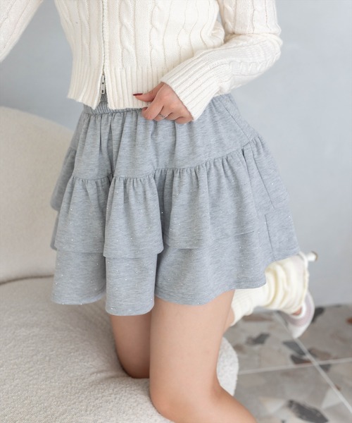 【2026SS】 clear きらめきをまとった、ラフで可愛いティアードスカート!ラインストーン2段ティアードスウェットミニスカート(セット可) 【デザイン】 スウェット素材にふんわりと広がる2段ティアードを組み合わせた、甘カジュアルの主役アイテムです。 軽やかに揺れるシルエットが女の子らしさを引き立て、どこから見ても可愛いボリューム感を演出します。 さりげなく散りばめられたラインストーンが、動くたびにキラッと輝きアクセントに。 ウエストは総ゴム仕様でラクな着心地ながら、自然にウエストマークできてスタイルアップ効果も◎ 【素材感】 着心地の軽いポリエステル素材 伸縮性:なし/ 透け感:なし / 裏地:インパンあり/ウエストゴム:あり 手洗いによる洗濯可 / ウェットクリーニング可 【コーディネート】 ショート丈のスウェットやパーカーを合わせてストリートガーリーに♪ ふんわりとしたニットやオフショルトップスと合わせて甘めにしても可愛いです。 【※お取り扱い上のご注意】 1:モニター環境等により実際の商品と多少色味が異なって表示される場合がございます。予めご了承下さい。 2:屋外で撮影された商品は、天候により多少実際のカラーと異なる場合があります。商品のカラーはトルソー(マネキン)の商品画像をご参照ください。 3:濃い色の商品は、お洗濯や摩擦等による移染にご注意ください。 4:末永くご愛用頂く為に、アテンションタグ・洗濯ネームを必ずご確認の上、着用又はお取り扱い下さい。 5:生産時期により、色、サイズ、デザイン、素材の質感が多少が異なる場合がございます。あらかじめ御了承下さいませ。