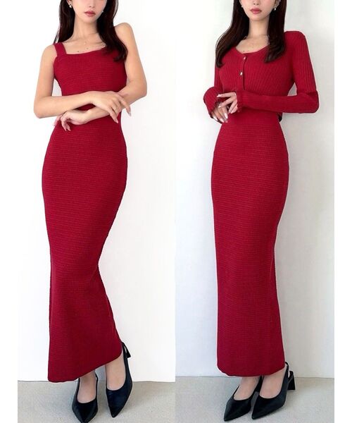 大人気のコンビニットワンピースが今年も登場! ▽デザイン▽ 昨年大人気だったコンビニットワンピース。セットアップとしても別々でも着まわせる万能アイテムです。 クロップド丈のカーディガンでスタイルUPを叶え、タイトワンピースで女性らしい綺麗なシルエットを演出します。 ▽カラー▽ 白、黒、赤、青の4色展開。 ▽スタイリング▽ セットアップとしてはもちろん、ワンピースだけでもカーディガン1枚でも着用いただけます。 シンプルなボタンのカーディガンはどんなコーディネートにも合わせやすい万能アイテム◎