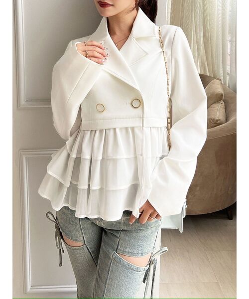 シフォンのフリルがポイントのテーラードジャケット ▽デザイン▽ テーラード×ダブルボタンでトラディショナルな雰囲気ながらも裾にはシフォンのフリルを付け 女性らしいポイントをプラスしました♪ 短めの着丈で、ワンピースやボトムと合わせやすいシルエットに◎ デザイン性あるジャケットなので羽織るだけでスタイリングが決まるアイテムです♪ ▽カラー▽ 白、グレー、ネイビーの3色展開。 ▽スタイリング▽ 甘くなりすぎないデニム合わせがおすすめ◎ デイリー使いだけでなくデートや女子会など特別なシーンにもお使いいただける春アウターです。