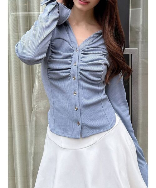 着まわしやすい万能ニットトップス ▽デザイン▽ フロント部分のギャザーデザインとボタンが印象的なニットトップス。 襟元はVラインですっきりした印象に。ミニマルな丈感と長めの袖丈でスタイルアップ効果も抜群! どんなボトムスにも合わせやすい万能ニットトップスです♪ ▽カラー▽ 白、黒、青の3色展開。 ▽スタイリング▽ デニムなどカジュアルなボトムはもちろん、スカートを合わせたフェミニンな着こなしもおすすめ◎ どんなボトムスにも合わせやすい万能トップスです。