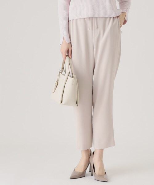 〇デザインポイント微光沢のサテン素材を使用し、キレイメに仕上げたイージーなテーパードパンツ。ドロストデザインで着脱しやすいウエスト総ゴム仕様です。ナチュラルストレッチのある素材なのでさらっとストレスフリーの穿き心地です。着心地の良さとスッキリ見えが叶うパンツです。〇素材ポイント微光沢のサテン素材で適度なとろみと落ち感が特徴です。シワになりにくくお手入れしやすいポリエステル100%。〇スタイリングポイントトップス次第でオフィスでもデイリーにもシーンレスに穿いて頂けるパンツです。【仕様】・ポケット数:横×2 後ろ飾りポケット×2・ウエスト総ゴム・裏地なし※グレージュ(050)はやや透け感があるため、インナーの着用をおすすめします。※照明の関係により、実際よりも色味が違って見える場合があります。また、パソコン・スマートフォンなどの環境により、若干製品と画像のカラーが異なる場合もございます。モデル情報:身長169cm B83 W61 H89 着用サイズ:38(M)店舗へのお問い合わせ商品番号:187-62351●製品寸法:34(SS):W64cm H91cm 股下60cm 前股上30cm 渡り幅29cm 裾幅17cm36(S):W68cm H94cm 股下62cm 前股上31cm 渡り幅30cm 裾幅18cm38(M):W71cm H97cm 股下62cm 前股上31cm 渡り幅31cm 裾幅19cm40(L):W74cm H100cm 股下63cm 前股上32cm 渡り幅32cm 裾幅19cm備考: