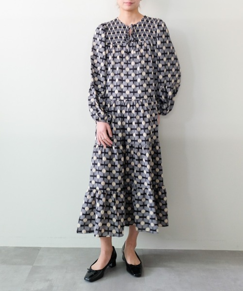 幾何学柄とティアードシルエットが目を惹く、華やかでクラシカルなプリントワンピース 【Material】 軽やかで落ち感があり、シワになりにくいポリエステル素材を使用。 デイリーにもお出かけにも活躍する扱いやすい生地感です。 インナー次第でロングシーズン楽しめます。 【Design】 クラシカルなジオメトリックプリントが印象的なロングワンピース。 ティアードデザインがふんわりとした動きを生み出し、華やかで存在感のある1枚に。 共布リボンつきなので、ウエストをしぼって着用していただくこともできます。 【Size】 ゆとりのあるリラックスシルエット。足首までのロング丈で、体型カバー効果も◎ 【Styling Point】 1枚で着映えするデザインワンピースは、ブーツを合わせてシーズンムードたっぷりに。 ジャケットやニットベストを重ねたレイヤードスタイルもおすすめです。 小物を変えるだけで、カジュアルからきれいめまで幅広いシーンに対応できます。 【商品特性】 透け感:なし 裏地:なし 伸縮性:なし 光沢感:なし 生地の厚さ:普通 ▼お気に入り登録 アイテムをお気に入り登録・・・再入荷やラスト1点、セールなどの情報をお知らせします! ブランドをお気に入り登録・・・新作や販売開始のお知らせを受け取れます! ※撮影時の光の加減やご使用の端末により、実際の色味と異なる場合がございます。あらかじめご了承くださいませ。
