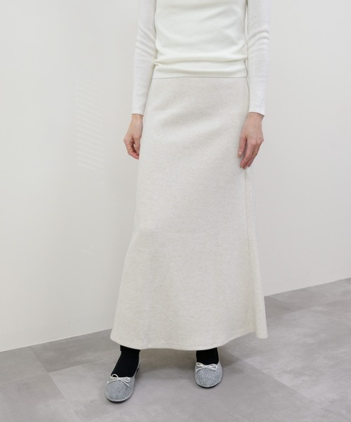 やわらかなマーメイドラインが女性らしさを引き立てるロングスカート 【Material】 ウールライクな表情のストレッチフラノ素材を使用。 ほどよい厚みとやわらかな風合いで、見た目にもあたたかく快適なはき心地です。 【Design】 腰まわりをすっきり見せつつ、裾に向かって緩やかに広がるマーメイドシルエット。 歩くたびに揺れるやわらかなラインが、シンプルながら上品な印象を演出します。 ウエストは光沢のあるゴム仕様なので、トップスインもおすすめ◎ 【Size 】 ヒップまわりはほどよくフィット。 裾にかけて自然に広がるマーメイドラインが落ち着きのある大人な雰囲気に。 【Styling Point】 カジュアルなニットやブルゾンを合わせてデイリーに、 シャツやショートジャケットを合わせればきれいめスタイルに◎ スニーカーからブーツまで合わせやすく、シーズンムードを高めてくれるスカートです。 【商品特性】 透け感:なし 裏地:なし 伸縮性:あり 光沢感:なし 生地の厚さ:普通 ▼お気に入り登録 アイテムをお気に入り登録・・・再入荷やラスト1点、セールなどの情報をお知らせします! ブランドをお気に入り登録・・・新作や販売開始のお知らせを受け取れます! ※撮影時の光の加減やご使用の端末により、実際の色味と異なる場合がございます。あらかじめご了承くださいませ。