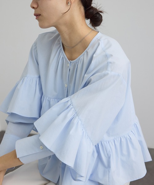 動くたびに揺れるティアードフリルが華やかな、大人のためのコットンブラウス。■デザイン/シルエット贅沢にあしらったティアードフリルが目を惹くデザインブラウス。コットン素材に落とし込むことで甘さを抑え、大人も取り入れやすい一枚に仕上げました。程よいクロップド丈がフリルとのバランスを整え、自然なスタイルアップ効果も期待できます。バックはやや長め丈でヒップラインをさりげなくカバー。衿元のボタン開閉で抜け感のある着こなしや、前開きで羽織としても活躍します。■素材さらりとした肌触りのコットン100%素材を使用。通気性・吸湿性に優れ、汗ばむ季節も快適な着心地です。上品な表面感でカジュアルになりすぎず、オフ・サックス・ベージュの3色展開。■コーディネートクロップド丈でワイドパンツやデニム、カーゴパンツとも好相性。甘さとカジュアル感をミックスしたスタイリングがおすすめです。また程よく甘さを抑えたデザインのため、入学式・卒業式などのセレモニーシーンやオケージョン、きれいめなお仕事スタイルにも対応。デニム合わせでデイリーに、スラックスやきれいめボトムと合わせれば特別な日にも活躍する、オンオフ兼用ブラウスです。■モデル身長:167cm 着用サイズF-----------------------------裏地:なし光沢感:なし透け感:ややありポケット:なし伸縮性:なし生地の厚さ:ふつう-----------------------------※画像の商品は光の照射や角度、お使いのモニター環境(パソコン・スマートフォン)により、色味が違って見える場合があります。※商品の色味は、商品アップ画像をご参照ください。