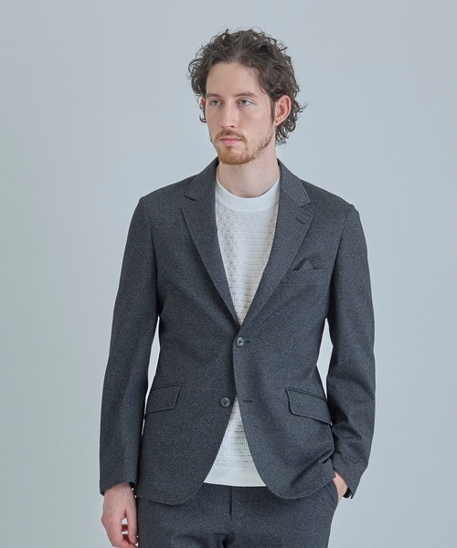 【軽さの中に、端正な佇まい】 和歌山で編み立てたハイゲージジャージを用いた、セットアップ対応のジャケット。 しなやかで快適な着心地と品のある表情を両立し、オンにもオフにも自然と馴染む一着です。 【デザイン/素材】 和歌山で生産されたハイゲージジャージ素材を使用。 ツイル柄に杢調の表情を加えることで、ジャージ素材でありながら織物のような奥行きと高級感を演出しています。 さらに特殊樹脂加工を施し、適度なハリ感と仕立て映えの良さを両立。 軽さ・ストレッチ性・シワになりにくさを備えた、実用性にも優れた素材です。 【シルエット】 全体をすっきりとまとめた細身のシルエット。 身体のラインを美しく見せながら、ジャージならではの伸縮性で動きやすく、軽快な着用感を実現しています。 【ディテール】 胸ポケットには同色のチーフが施され、パーティーや結婚式、入学式などのフォーマルなシーンでも活躍。 きちんと感のあるルックスと、気負わず羽織れる快適さの両立で、セットアップスタイルはもちろん、単品使いでも洗練された大人の装いが完成します。 同色同素材パンツ:M0161FP008 【ACTIVE TAILOR】 着る人の快適性にフォーカスして、さまざまな機能を有したテイラードコレクション。 ビジネスからカジュアルまで幅広いシーンで活用できるアイテムを展開。 高機能素材を採用したセットアップやジャケットを中心に、心地よさとスマートさを兼ね備えた多彩な着こなしを提案しています。 モデル:身長:185cm バスト:90cm ウエスト:77cm ヒップ:92cm 着用サイズ:03(L) ※照明・光の加減、PCやスマートフォンなどの環境により、製品と画像のカラーの見え方が異なる場合がございます。 ※画像はサンプルのため、色味やサイズ等の仕様が変更になる場合がございます。 ※サイズは弊社規定の採寸によって記載しておりますが、若干の個体差が生じる場合がございます。