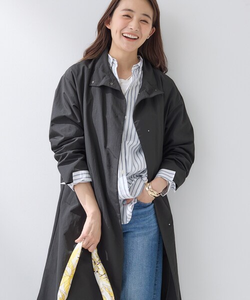 【デザインポイント】首元をすっきり見せるスタンドカラーが特徴のロングコートです。無駄を削ぎ落としたミニマルなデザインに、比翼仕立ての小さなメタルスナップボタンがクリーンな印象をプラスします。バサッと羽織るだけで、こなれ感のある今っぽい抜け感シルエットが完成します。【スタイリングポイント】カジュアルな着こなしはもちろん、きれいめなパンツやIラインのスカートにも自然に馴染むアウターです。インナーの厚さを選ばないゆとりのあるシルエットなので、春先から肌寒い端境期まで長く着用可能です。襟を立ててモードに、開けて軽やかにと表情を変えられます。【素材ポイント】リサイクルナイロンを使用した地球環境に配慮したサスティナブルな素材になります。適度なハリコシを持った表情に、さらっとして肌離れの良い清涼感のある着心地と撥水性/UVケア性も兼ね備えた素材になっております。【仕様】・ポケット数:横×2・裏地なし※この製品は、太陽光線中の紫外線(UV)を通しにくくします。この効果は永久的ではありません。※照明の関係により、実際よりも色味が違って見える場合があります。また、パソコン・スマートフォンなどの環境により、若干製品と画像のカラーが異なる場合もございます。【生地詳細】透け感:ややあり伸縮性:なし生地の厚み:普通裏地:なし洗濯方法:洗濯機洗い可モデル情報:身長167cm B80 W57 H83 着用サイズ:38(M)店舗へのお問い合わせ商品番号:127-95200●製品寸法:05(XXS):着丈92cm B96cm 袖丈49cm 肩幅47cm13(LL):着丈100cm B128cm 袖丈50cm 肩幅60cm15(3L):着丈100cm B132cm 袖丈50cm 肩幅61cm19(5L):着丈102cm B140cm 袖丈49cm 肩幅62cm36(S):着丈97cm B113cm 袖丈50cm 肩幅53cm38(M):着丈98cm B116cm 袖丈51cm 肩幅54cm40(L):着丈99cm B119cm 袖丈52cm 肩幅55cm備考:重量:約315g(サンプルサイズ)