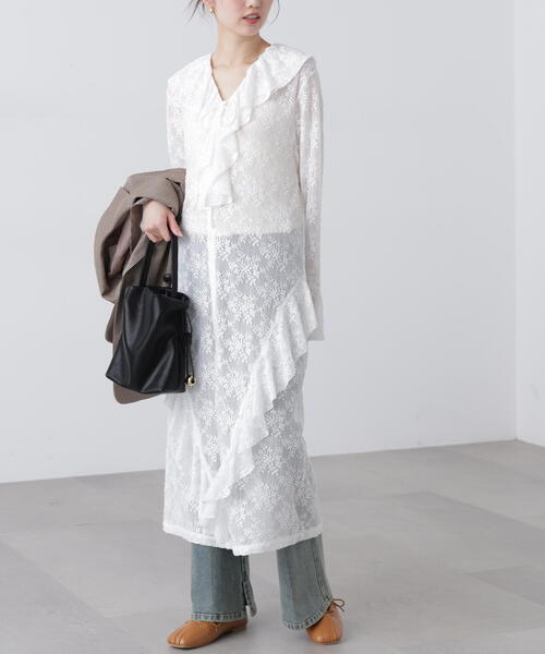 カットソーレース素材のラッフルを大胆にあしらった贅沢な1着。フロントだけでなく、裾にもラッフルフリルをあしらい、歩くたびに動きが出るデザインです。袖口はフレアにし、レイヤード時に袖口からのぞくデザインになっています。フロントボタンで開閉でき、羽織りにもレイヤードにも着回せます。カットソーレース生地は肌触りが良く伸縮性もあるので、ストレスフリーな着心地です。ウエストから下のボタンを開けて、デニムを穿いてジャケットを羽織ると、ロマンチックなプレッピーテイストになるのでおすすめです。※モデルの着用画像の場合、光の当たり具合により、実際の色味と異なって見えることがございます。色味は、商品単体の画像をご参照ください。商品特性■透け感:あり■生地の厚さ:薄手■裏地:なし■伸縮性:ややあり■光沢:なし■シルエット:スタンダード---------------------------------------------------◆商品のお気に入り登録◆お気に入りアイテムの値下げ・再入荷・在庫1点などの通知を受け取ることができます。◆ブランドのお気に入り登録◆新商品や再入荷、セール、クーポン配布などお得な情報を受け取ることができます。---------------------------------------------------