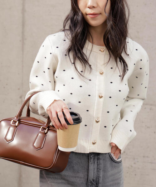 コットンアクリルのダブルジャガード編みをミドルゲージで仕上げた、ふっくらとした風合いのカーディガン。主張しすぎない小さめのドット柄と、ゴールドカラーのハート型ボタンが愛らしさを演出しつつ、コットン混素材で程よくカジュアルな印象に見せてくれます。デニムと合わせたカジュアルスタイリング、バルーンシャツミニワンピース(ブランド品番131-6140201)合わせもおすすめです。※モデルの着用画像の場合、光の当たり具合により、実際の色味と異なって見えることがございます。色味は、商品単体の画像をご参照ください。商品特性■透け感:なし■生地の厚さ:厚手■裏地:なし■伸縮性:あり■光沢:なし■シルエット:スタンダード---------------------------------------------------◆商品のお気に入り登録◆お気に入りアイテムの値下げ・再入荷・在庫1点などの通知を受け取ることができます。◆ブランドのお気に入り登録◆新商品や再入荷、セール、クーポン配布などお得な情報を受け取ることができます。---------------------------------------------------