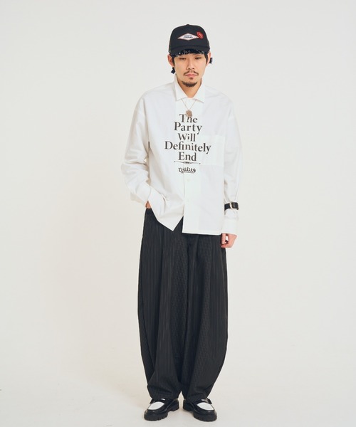 着丈、身幅とも大きく設定されたワイドシャツ。生地には度詰めの高級オックスを使用し、オックス特有の凹凸が少なく滑らかで上品な仕上がりに。フロントに大きくプリントされたメッセージは某情報誌の6ページを連想させる。