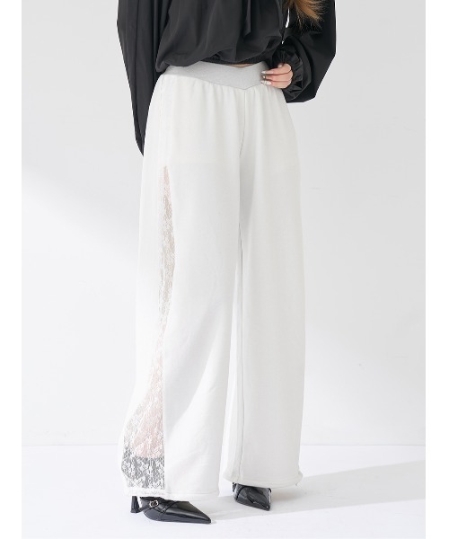 【抜け感も、スタイルアップも欲張りに。】【Design】裾に向かって緩やかにすぼまる立体的なバレルレッグとV字にしたウエストカットが、ルーズなシルエットでありながら自然な足長効果を期待できる旬のスウェットパンツ。表面の煌めくラメ感と、パンツのサイドにはさりげなく同色のレースをドッキングし、カジュアルながらも女っぽさを感じていただけるデザインに仕上げました♡また、裾部分のゴムを絞ることでジョガーシルエットでも着用でき、様々なシーンで活躍すること間違いなしです◎【Styling】クロップドトップスやタイトなトップスと合わせることでバランス良く着用していただけます◎また、あえてルーズなトップスやアウターを合わせて、抜け感のあるスタイリングもおすすめです。【Fabric】表面にラメを散りばめた程よい厚みのスウェット素材で、ロングシーズン活躍します。クールで大人の余白を感じるホワイト・フェミニンに着れるピンク・春らしい爽やかなイエロー・儚げで淡いサックス・万能で何度でも着たくなる万能なグレーの5色展開。