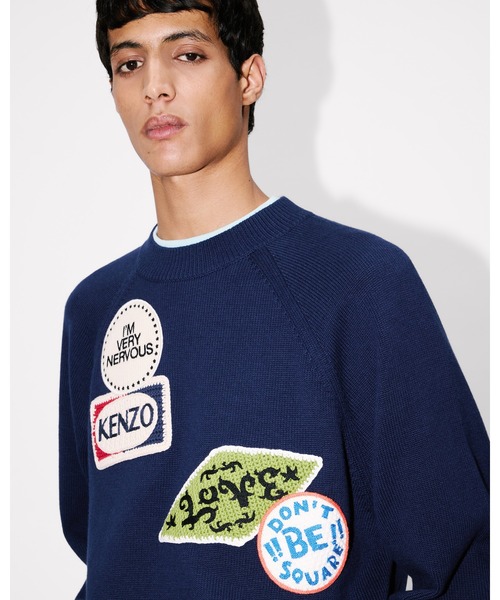 'KENZO Badges' エンブロイダリー ジャンパー コットンウール 刺繍入りクロシェバッジ シーズンロゴの刺繍を施したアートワーク モデル:身長185cm、着用サイズ:M この製品は通常のサイズをお選びください。