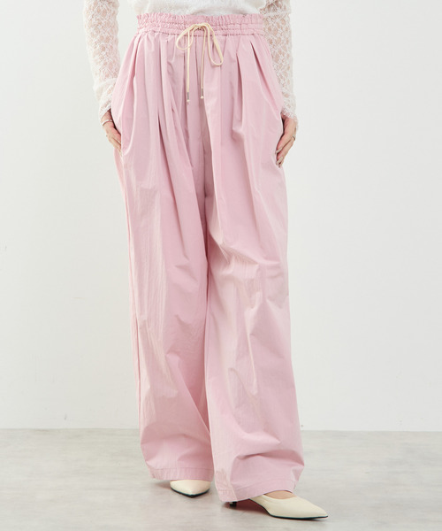 たっぷりと入ったタックとギャザーが生み出す、ふんわりルーズなシルエットが魅力の“タックギャザーパンツ”。 軽やかな穿き心地ながら、高密度でハリのあるタイプライター素材を使用しており、シルエットがきれいに際立ちます。 ウエストはゴム+紐でサイズ調整ができ、ストレスのないフィット感に。 裾はラフにロールアップしてもバランスよく決まり、スタイリングにこなれ感をプラスしてくれます。 一枚で主役になる存在感と、デイリーに嬉しい快適さを兼ね備えた、万能ボトムスです。