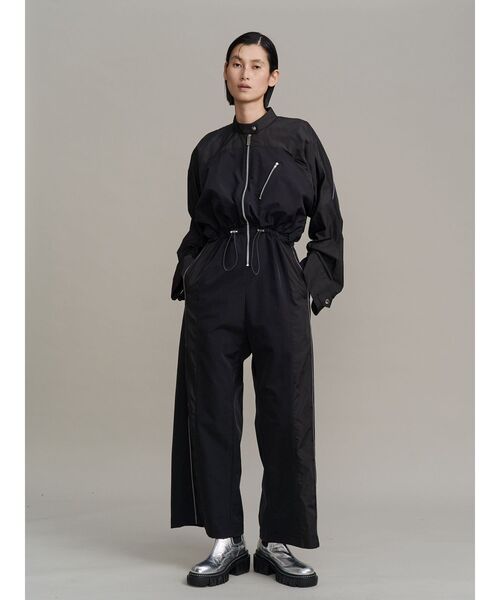 ウィンドブレーカーのディテールを落とし込んだジャンプスーツ。 ハリとしなやかさを兼ね備えたタフタ素材が、見頃から太めの袖口にかけて生まれる立体的なボリューム感を演出します。 袖下にはゴムスピンドルを施し、袖丈を自在に調整可能。 パンツ部分はワイドシルエットで、サイドに大胆な曲線を描く同トーンの配色切り替えをアクセントに。ウエストはゴムスピンドルで一部調整可能。 大きめにつくられた袖口の大きさはドットボタンで調整可能。 スポーティーな要素をベースにしながら、異素材の切り替えでモードな印象に仕上げた一着です。 ※製品時、モデル着用サンプル(38サイズ)より着丈+3cm、ヒップぐるり-4cmになります。 ----------------- 透け感:なし 生地の厚さ:普通 裏地:なし 伸縮性:なし ウエスト:一部ゴム -----------------