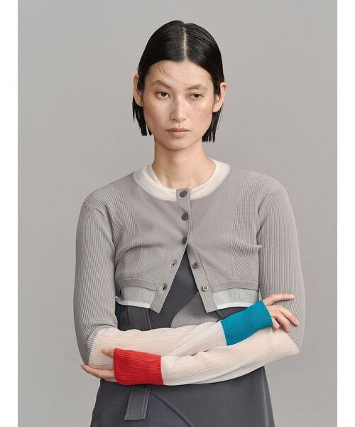 UN3D.定番のショート丈ニットカーディガン。シアー素材をドッキングすることで春夏らしい軽やかな印象に◎配色がポイントになり、シンプルなスタイリングに羽織るだけでコーディネートが決まります◎コンパクトに折りたためるので持ち運びにも便利です。 ----------------- 透け感:ややあり 生地の厚さ:薄手 裏地:なし 伸縮性:あり -----------------