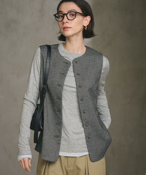 シルエットにもこだわったアレンジ自在なツイードライクベスト■デザイン表面感のあるツイードライクな生地に大きめのクルミボタンが目を引くノーカラーベスト。品のあるすっきりとした首周りに、ワントーンでまとめたシックな雰囲気が大人のムードを引き立ててくれます。バックスタイルは単品使いのときも映えるペプラムシルエット。ツイードタッチの素材感を活かしたシンプルなデザインで、お仕事やセレモニー、デイリー使いまで幅広いシーンで活躍する一着です。■素材小さなネップのある糸使いで凹凸感がありながらも、すっきりとした上品な印象を与えてくれるツイードライクな生地を使用。■コーディネート同素材のパンツとのマニッシュなスタイルがおすすめ。きれいめなブラウスやカジュアルなカットソーなど、合わせるインナー次第でさまざまな着こなしを楽しめる万能なアイテムです。・同素材でジャケット(対象品番:16221000014)とパンツ(対象品番:16141000040)のご用意もございます。============================裏地:あり透け感:なし伸縮:なし光沢感:なしケア方法:ドライクリーニング============================【注意事項】※商品に「取り扱い上の注意書き」、「洗濯表示」がございます場合は、使用前に必ずご確認ください。※商品画像は、光の当たり具合やパソコンなどの閲覧環境により、実際の色味と異なって見える場合がございます。あらかじめご了承ください。※商品の色味の目安は、商品単体の画像をご参照ください。店舗へお問い合わせの際は、全国のBEAUTY&YOUTH各店舗まで下記の品名/品番をお申し付けください。品名:BY PE/R TWD/L SET VST 品番:16221000015