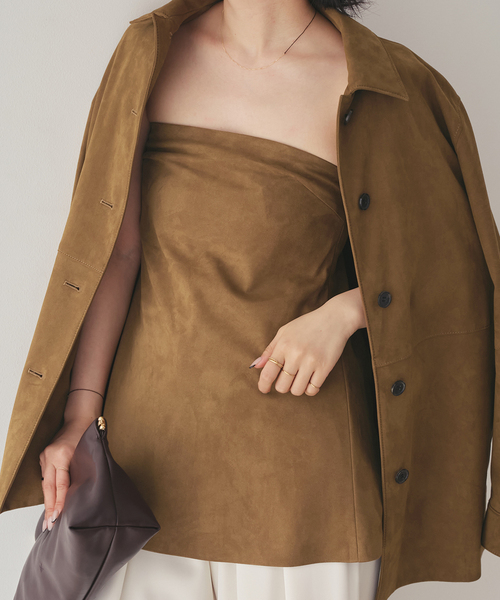 上質なフェイクスエードを使用したビスチェ。 フロントのカッティングがまっすぐ美しく見えるよう仕立て、すっきりとした印象に仕上げました。 長めの着丈にすることで甘さを抑え、大人が取り入れやすいバランスに。 背面には内側に隠しゴムを施し、程よいフィット感と快適な着心地を両立。 ゴム部分にはボタンホールがあるので、サイズ調整ができるのも嬉しいポイント。 シャツやカットソーとのレイヤードはもちろん、同素材のブルゾンとセットアップで着用するのもおすすめ。 ********************** 透け感:なし 裏地:なし 伸縮性:なし 光沢感:なし 生地の厚さ:普通 ********************** ※シリーズのご案内 Suede like シャツブルゾン(商品番号:26011922201010) ※取り扱いについては、商品についている品質表示でご確認ください。 ※ 店頭及び屋内外での撮影画像は、光の当たり具合で色味が違って見える場合があります。 商品の色味は、商品アップ画像をご参照ください。 また、お客様のお使いのPCのモニター環境などにより色味が違って見える場合があります。 予めご了承の上ご注文ください。 本体:ドライクリーニング