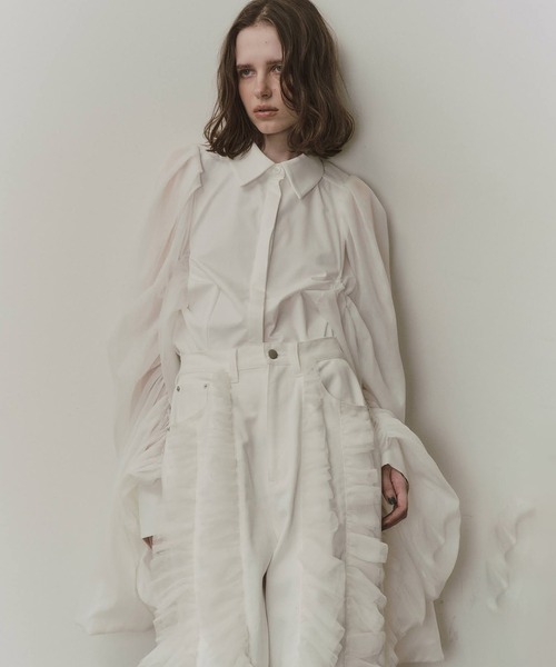 ●design" wing sleeve "名前の通り、羽のように軽く、オーガンジーを使用したボリュームたっぷりな袖がポイント。身頃はシンプルなシルエット。アームホールを広げることですっきりと見せてくれ、袖の切替位置はグッと内側に入れることで肩馴染みの良いシルエットに◎前シリーズと比べ、襟をシンプルにすることでよりモードでスタイリッシュな洗練された印象に。袖の内側にシャーリングを作り、手元に向かってボリュームたっぷりなスリーブは手元カフスで袖落ちしないよう工夫しています。●fabric袖は柔らかなソフトオーガンジー。身頃はハリのあるシャツ生地を使用していて異素材のドッキングが高バランス。●styleボリュームのあるデザインなのでデニムやワイドボトムなどでカジュアルダウンしての着用も◎合わせるアイテムや小物によってはオケージョンシーンでのコーディネートもおすすめ。●wearing sceneピクニック,レジャー,ドライブ,フェス,イベント,お出かけ,女子会,ランチ,記念日,パーティー,二次会,結婚式●colorブラック,ホワイト●sizeFREE・・・・・・・・・・・・厚み:薄手伸縮性:なし肌触り:普通裏地:なし透け感:袖ややあり・・・・・・・・・・・・■商品のお気に入り登録再入荷の通知や、ラスト1点の通知、セールの通知がいち早く届きます!■ブランドのお気に入り登録新商品や再入荷など、いち早くブランドのお得情報が届きます!