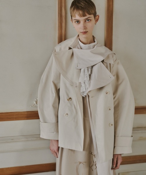 ●design 春のスタイリングを華やかにする、大きなリボンが目を惹くショートトレンチ。 衿付け部分から別布ボウタイが付いており、 スカーフのように首に巻いたり、リボン結びなど、さまざまなスタイリングを楽しむことができ、 可愛らしくも、モードでスタイリッシュにも着こなせるデザイン。 袖は肘部分に膨らみを持たせ、カーブを描いた立体的なスリーブにすることで ボリュームをKEEPし、ゆったりとした着心地に。 ショートといってもヒップラインが隠れる長さで ゆったりめなサイズ感なので中に着るアイテムによっては ロングシーズン着用いただけます◎ ●fabric リボン部分はやや光沢のある生地をドッキング。 全体的になめらかな肌触りとハリのある、きちんと感が春の軽アウターにぴったり。 ●style 様ざまなスタイルが楽しめる。 フロントの大きなリボンが主役なデザインで、羽織るだけで華やかなスタイリングに。 ●color ベージュ,ブラック,アイスベージュ ●wearing scene ピクニック,レジャー,ドライブ,フェス,イベント,お出かけ,女子会,ランチ,パーティー,二次会,結婚式 ●size FREE ・・・・・・・・・・・・ 厚み:普通 伸縮性:なし 肌触り:普通 裏地:なし 透け感:なし ・・・・・・・・・・・・ ※ボウタイは取り外し不可 【サイズ補足】 裾幅70cm 袖幅26cm 袖口幅16cm 天幅17cm 前下がり8cm 衿幅3cm+8cm リボン全長140cm 幅16cm~24cm ■商品のお気に入り登録 再入荷の通知や、ラスト1点の通知、セールの通知がいち早く届きます! ■ブランドのお気に入り登録 新商品や再入荷など、いち早くブランドのお得情報が届きます!