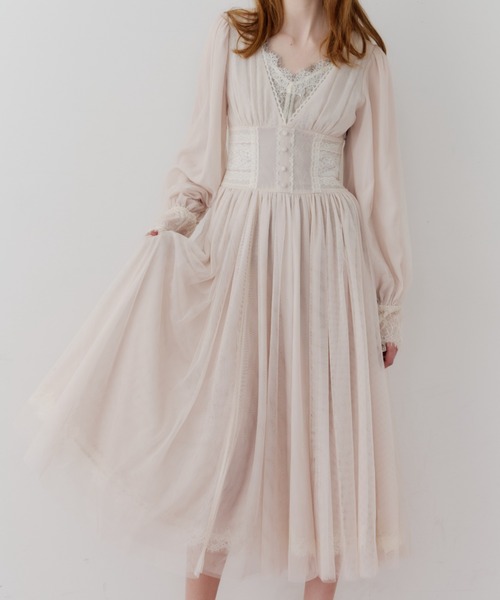 【J1U by LA BELLE ETUDE】●designLA BELLE ETUDEのアイコン" Grimm "をJ1U by LA BELLE ETUDEでリバイバル♡ヴィンテージライクなデザインはそのまま、レース感をアップデート。大きめなVネックに覗かせたレースが大人かわいい印象に。バスト下はコルセット調デザインとなっていてメリハリのあるシルエットが完成。背部はシャーリングになっているので程よい締め付け感でストレスなく着用いただけます。手元は長めのレースで細部まで華やかに。ぐるりと手首がゴムになっているのも嬉しいポイントです。●fabric上部は程よくシアーなシフォン生地。スカート部分はシフォンの上に二枚のチュールを重ね、軽やかな着心地と見え方に。肌に触れるシフォンは柔らかく、肌馴染みも良くなっています。●style一枚で完成するメリハリのあるワンピース。足元や羽織を変えるだけでオールシーズン着まわしの効く一枚です。●colorアイスベージュ,ライトグリーン,ネイビー※ライトグリーンはレース部分がライトブルー寄りの色合いとなっております。●wearing sceneピクニック,レジャー,ドライブ,フェス,イベント,お出かけ,女子会,ランチ,パーティー,二次会,結婚式●sizeFREE・・・・・・・・・・・・厚み:薄手伸縮性:なし(ウエストシャーリング)肌触り:柔らかい裏地:なし透け感:ややあり・・・・・・・・・・・・【サイズ補足】シフォン裾幅192.2cm チュール裾幅307.2cm ウエスト幅(NP~35cm) ゴム上がり/伸寸35cm/38cm■商品のお気に入り登録再入荷の通知や、ラスト1点の通知、セールの通知がいち早く届きます!■ブランドのお気に入り登録新商品や再入荷など、いち早くブランドのお得情報が届きます!