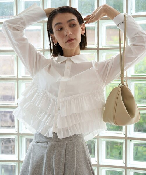モード感のある甘すぎないフリルがポイント商品ポイント・裾にフリルが施されたデザイン性のあるシャツ・広めの身幅で締め付け感がなくリラックスした着心地・身頃がフレアシルエットなので袖はすっきりさせ、モードな印象に・1枚で着映えしつつボトムを選ばないスタイリングしやすいバランス・セレモニーシーンにもおすすめスタイリングポイント・スラックスできれいめに・デニム合わせの春らしいカジュアルコーデもおすすめ【ホワイト着用アイテム①】coming soon【ホワイト着用アイテム②】スリットポケットストレートデニム【ベージュ着用アイテム】2タックワイドパンツ【ブルー着用アイテム】2タックワイドパンツ**********************透け感:ホワイトややあり裏地:なし伸縮性:なし光沢感:なし**********************※店舗へは1/22の入荷を予定しております。(配送状況等により予告なく日程が変動する場合がございます。)▼洗濯方法液温は30℃を限度とし、洗濯機で非常に弱い洗濯ができる※撮影場所やお使いのモニター環境により若干お色味が異なる場合がございます。特にロケの撮影では明るく見える傾向にございます。※商品はサンプルで撮影をしております。若干の仕様が変更になる場合がございますので予めご了承の上ご注文くださいますようお願いいたします。▼商品のお気に入り登録完売カラーの再入荷通知や、ラスト1点の通知、セールの通知も受け取ることができます。▼ブランドのお気に入り登録新商品や再入荷など、いち早くブランドのお得な情報を受け取ることができます。