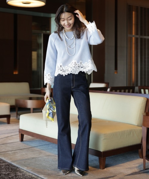 程よく広がるサイドフレアが脚のラインをきれいに見せてくれるスリムデニム。腰まわりはすっきりと、裾に向かって自然な動きが生まれ、後ろ姿までバランス良く決まります。甘さのあるレーストップスからシャープなブラウスまで好相性で、オンオフ問わず着回しやすい一本です。【ご注意】※撮影照明の関係により、実際の商品と色味が異なって見える場合がございます。また、パソコン・スマートフォンなどの環境により、製品と画像のカラーが異なる場合もございます。予めご了承ください。※商品画像はサンプルのため、色味やサイズ等の仕様に変更がある場合がございますので、予めご了承ください。