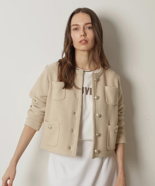 こちらの商品は白・ベージュ・ピンク・ネイビーの3色展開予定です。※表示されていないカラーについては後日販売開始とさせていただきます。 繊細な柄編みが上品な印象を与えるジャケットカーディガン。 フロントにはエンブレムボタンを施しており、煌びやかなアクセントになります。 薄手のカットソーやキャミワンピースとレイヤードしたスタイリングがおすすめ。 季節の変わり目のお出かけスタイルに重宝したいアイテムです。 【ご注意】 ※撮影照明の関係により、実際の商品と色味が異なって見える場合がございます。 また、パソコン・スマートフォンなどの環境により、製品と画像のカラーが異なる場合もございます。 予めご了承ください。 ※商品画像はサンプルのため、色味やサイズ等の仕様に変更がある場合がございますので、予めご了承ください。