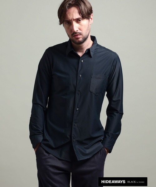 ■デザイン衿先にワイヤーを仕込んだショートレギュラーカラ-シャツ。ヨーク裏に裏地を使いアクセントになる様にしています。■サイズストレッチ素材になりますので、ウエストシェイプを入れたシャープなシルエットの細身サイズです。■素材ナイロンとポリウレタンの混紡糸を使用した2wayストレッチの細かな格子状のジャガード素材を使用。プリッとした気持ちの良い風合いで、タテヨコによく伸びるハイストレッチ性と高い通気性が魅力の素材です。伸縮性:あり生地の厚さ:やや薄手裏地:なし■注意点衿端に付属としてプラスティック線材を使用しています。局部的に繰り返し折り曲げたり、その部分にアイロンをあてないで下さい。【HIDEAWAYS BLACK】品質を重視し、シックで落ち着いた雰囲気の高級感のあるテイストを基本とし、より大人の男性も着回しやすいシンプルなビジネス対応も視野にいれたドレカジスタイルを提案。ネームも特別なブラックタグを使用し、より高級感を演出しています。※画像の商品はサンプルです。 実際の商品とは仕様・加工・サイズ・素材が若干異なる場合がございます。※掲載画像の商品の色味は、撮影場所や光の当たり具合などにより色味が異なって見える場合がございます。 商品の色味は、生地アップの画像をご参照ください。 また、お客様のお使いのPC・スマートフォン等のモニター環境などにより色味が異なって見える場合がございます。 予めご了承の上ご注文ください。※着用モデル身長182cm B89cm W75cm H90cm 着用サイズ48