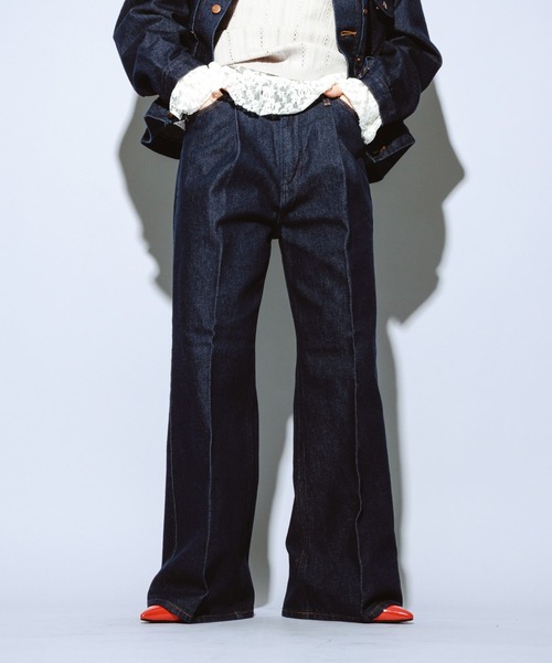 老舗ジーンズブランド【Wrangler】完全別注! RAGEBLUEでしか手に入らない珠玉のアイテムが誕生。 ■ポイント ランチャー特有のなめらかな落ち感と、インディゴの深みを掛け合わせたタックストレートパンツ。 太すぎず、細すぎない絶妙なシルエットなので、スタイリングを選ばず様々なシーンで活躍してくれます。 ウエストに入ったタックによる控えめな立体感が、腰まわりをすっきりと美しく演出。 センタープレスを入れることで、縦のラインを強調し、より脚回りを綺麗に魅せてくれます。 Wranglerらしいアイコニックなディテールを残しながらも、都会的で大人っぽい表情に仕上げています。 同生地を使用したジャケットとセットアップとしても着用可能です。 シンプルでありながら、こだわりの詰まった一着です。 ■おすすめの着こなし ☆クリーンに着こなすなら・・・ センタープレスの入ったデザインなので、クリーンなスタイリングにもぴったり。 ブラウスやテーラードジャケットと合わせて大人な着こなしもおすすめ。 太すぎないシルエットなので、ワンピ―スにレイヤードしていただくのも◎です。 ☆セットアップで着るのもおすすめ 同生地を使用したジャケットと合わせれば、セットアップスタイルもお楽しみいただけます。 カジュアル派ならパーカーやポロシャツなどをインナーにした、シティ感のあるスタイリングが◎ 鮮やかなカラーを差し色にした、春らしい着こなしもおすすめです。 ■素材 柔らかい肌触りが特徴の綿100%使用。 程よい厚みとハリ感は、シーズンを選ばず長く着用いただけます。 ▼同素材を使用したブルゾンとセットアップ着用可能です。 <Wrangler>別注デザインブルゾン 商品コード:102176181