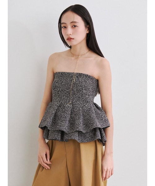 【構築的なフォルムが目を引くモードなペプラムニットベアトップス】 【Design/Styling】 大胆なペプラムフリルが主役級の存在感を放つニットベアトップス。 タックで構築的に作られたペプラムは、フロントは2段、バックは1段のフリルにしてさらに立体的に。 ヒップにかかる後ろテールのデザインも手伝って、サマになるシルエットを叶えました。 バックスタイルには、エッジィな金属ファスナーをプラス。 さりげなくあしらったグログランリボンがファスナーのスムーズな開閉をフォローします。 フィット感のあるボディ部分はしっかりストレッチを効かせてストレスフリーに。 上端には平ゴムをぐるりと通して、安心感のある着心地を目指しました。 1枚着としてはもちろんシャツやシアートップスとのレイヤードコーデもおすすめです。 色展開は全4色。こなれ感のあるBEG、鮮やかなトーンで目を引くBLU、スタイリッシュなBLK、都会的に仕上げたMIXからお選びいただけます。 ※照明の関係により、実際よりも色味が違って見える場合があります。 またパソコン・スマートフォンなどの環境により、若干製品と画像のカラーが異なる場合もございます。予めご了承ください。 商品の色味は、商品単品画像をご参照下さい。 ※商品画像はサンプルのため、色味やサイズ等の仕様に変更がある場合がございますので、予めご了承ください。