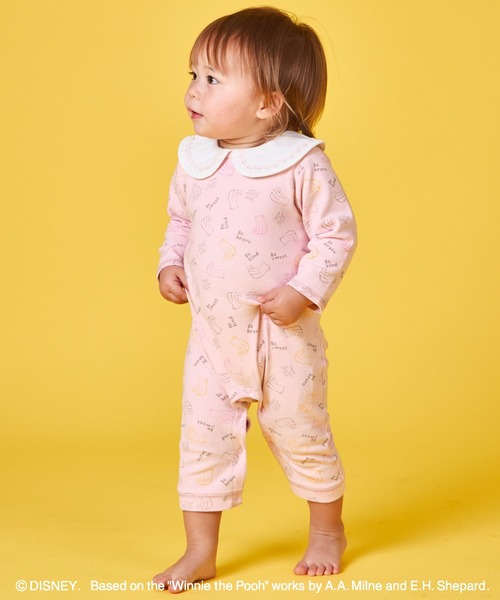 丸襟がとってもキュートな、総柄ロンパース! 肌触りの柔らかいフライス素材使用で、快適な着心地の1枚です。 股下と背中にスナップボタンが付いており、スムーズにお着替えできるのも嬉しいポイント! キッズアイテムのレギンスと同柄なので、姉弟・姉妹でのリンクコーデにもおすすめです◎ © Disney. Based on the ""Winnie the Pooh"" works by A.A. Milne and E.H. Shepard. 【ポケット】 なし 【伸縮性】 あり 【透け感】 透けない 【クリーニング】 洗濯機洗い可(ネット使用) 【裏地】 なし モニター・環境等により実際の商品と色味が多少異なって表示される場合がございます。 また、生産時期により色味が若干異なる場合がございます。予めご了承ください。 【濃色品・色落ち色移り】 濃色品は、色落ち・色移りをする恐れがあります。摩擦(特に湿った状態での摩擦)や汗や雨などで他の衣料や下着(特に白物)に色移りしますので、十分ご注意ください。