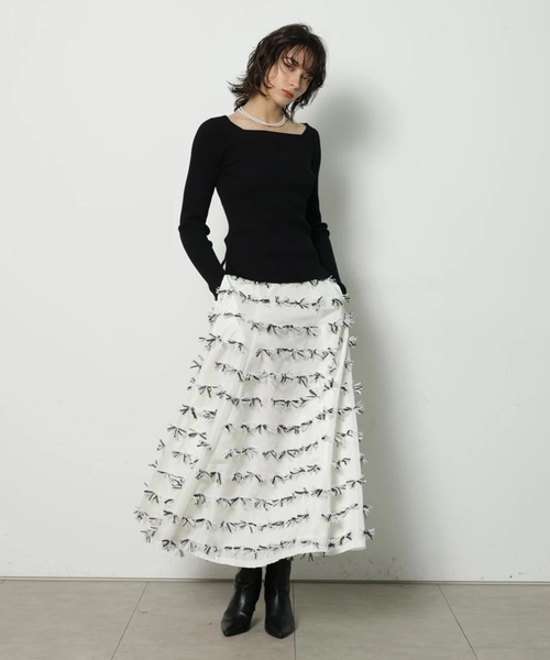 ・左脇ファスナー/後ろゴム/裏地付き ふんわりとしたリボンジャガードがスタイリングに立体感をプラスするスカート。 裾に向かって広がるフレアシルエットで、自然な動きを演出します。 裏地が付いているため安心して着用できるのもポイント。 休日のお出かけコーデに重宝したいアイテムです。 【ご注意】 ※撮影照明の関係により、実際の商品と色味が異なって見える場合がございます。 また、パソコン・スマートフォンなどの環境により、製品と画像のカラーが異なる場合もございます。 予めご了承ください。 ※商品画像はサンプルのため、色味やサイズ等の仕様に変更がある場合がございますので、予めご了承ください。