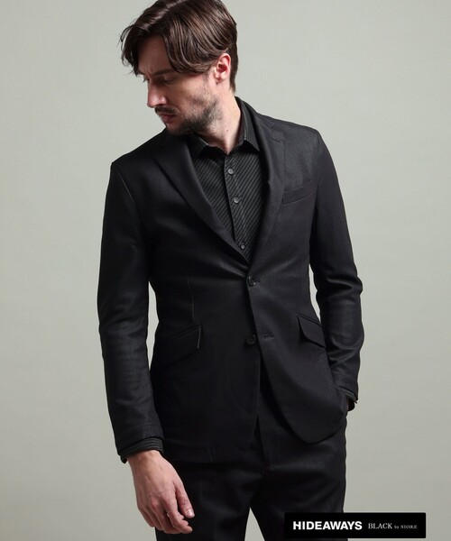 ■デザイン2つボタンタイプのラペルジャケット。背裏、脇のフラップポケット、袖口は開き見せ仕様。よりフォーマルな仕様に近づける事で、ビジネスシーンでも着用出来る様にしております。同素材でパンツ「61655130」を展開しておりますので、セットアップでのスタイリングもおすすめです。■サイズややゆったり目のサイズ設定ですが、ウエストにシェイプを入れる事でシャープな印象に仕上げています。■素材吸湿性の高い再生繊維のレーヨン糸とプリッとしたコシを出すナイロン糸を使用したデニム調のハイパワーストレッチ素材を使用。ブライトのポリエステル糸を使用する事で他にはない高級感のある光沢を出しています。キックバックの利いた高いストレッチ性ととろっとした上品な落ち感、さらりとした風合いで肌触りも抜群です。伸縮性:あり生地の厚さ:普通裏地:背裏あり■注意点摩擦によりピリングが起こることがあります。【HIDEAWAYS BLACK】品質を重視し、シックで落ち着いた雰囲気の高級感のあるテイストを基本とし、より大人の男性も着回しやすいシンプルなビジネス対応も視野にいれたドレカジスタイルを提案。ネームも特別なブラックタグを使用し、より高級感を演出しています。※画像の商品はサンプルです。 実際の商品とは仕様・加工・サイズ・素材が若干異なる場合がございます。※掲載画像の商品の色味は、撮影場所や光の当たり具合などにより色味が異なって見える場合がございます。 商品の色味は、生地アップの画像をご参照ください。 また、お客様のお使いのPC・スマートフォン等のモニター環境などにより色味が異なって見える場合がございます。 予めご了承の上ご注文ください。※着用モデル身長182cm B89cm W75cm H90cm 着用サイズ48