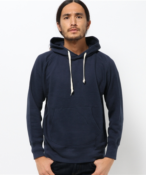 トンプキン裏毛とは“1時間に1m”という速さの旧式の吊り編み機で編まれた大変貴重な裏毛です。現在の編み機が“1時間に10m”という速さで“上から下へ”編みたてられるのに比べて、トンプキン裏毛は“下から上へ”と非常にゆっくり編み立てられ、その重力に反した手間のかかる編み方が品質の良さを物語っています。そのこだわり通り、柔らかく肌触りも良く着心地も抜群です。シンプルな無地のフード付き長袖ラグランプルオーバー。どんなコーディネートにも合わせやすい一着に仕上がっています。