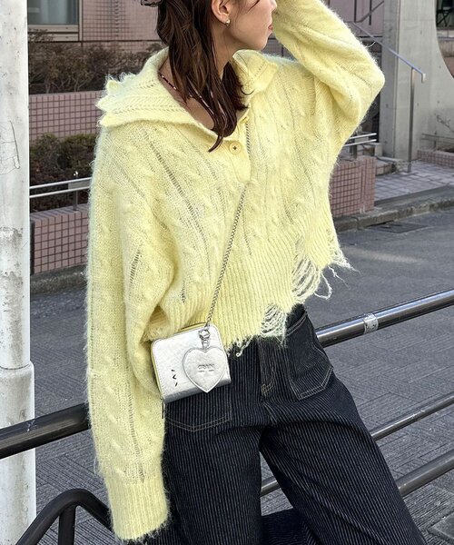 甘さも、ラフさも、ちょうどいいニットポロ▼ポイント甘く編み立てたシアーニット素材を使用した、軽やかなポロデザインニット。編み柄の立体感と透け感が絶妙に重なり、前後どこから見ても表情のある一枚に仕上げました。裾やバックに施したダメージ加工が、フェミニンすぎない抜け感をプラス。ボタン部分のさりげない配色刺繍もポイントです。ショート丈(0)とレギュラー丈(1)の2サイズ展開で、好みやスタイリングに合わせて選べます。▼スタイリングミニボトムと合わせて、ニットの透け感と丈バランスを楽しむスタイリングがおすすめです。デニムやスラックスに合わせれば、甘さを抑えた大人っぽい着こなしも叶います。---------------------------------------------------透け感:あり伸縮性:あり裏地:なし光沢:なし---------------------------------------------------家庭洗濯: 40℃限度/手洗い可タンブル乾燥: 不可アイロン: 低温110℃までクリーニング: 石油系溶剤による弱いドライクリーニング可、非常に弱い処理によるウェットクリーニング可---------------------------------------------------※着用、お取り扱いの際は、商品についている品質表示とアテンションタグを必ずご確認下さい。※画像の商品はサンプルです。実際の商品と仕様、加工、サイズが若干異なる場合がございます。※可能な限り実物に近いカラーにて掲載していますが、撮影環境やモニター環境などにより製品と画像のカラーがやや異なって見える場合もございます。予めご了承ください。【お買いものをよりお楽しみいただく為に!!】▼商品のお気に入り登録(ハートマークをクリック)お気に入りアイテムの完売カラーの再入荷通知や、ラスト1点の通知、セールの通知も受け取ることができます。▼ブランドのお気に入り登録新商品や再入荷、クーポン配布などのお得な情報を受け取ることができます。