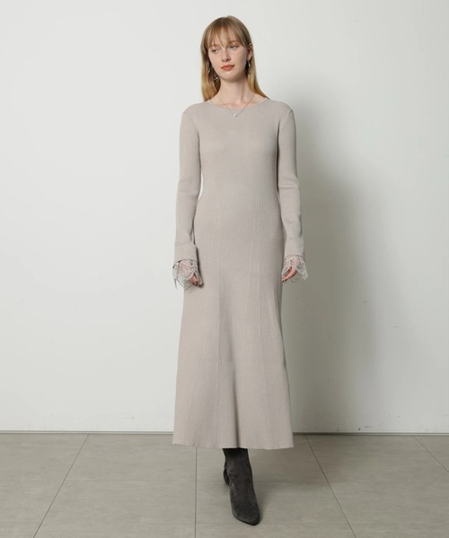 こちらの商品は白・ベージュ・ネイビーの3色展開予定です。※表示されていないカラーについては後日販売開始とさせていただきます。袖口のレースがエレガントなアクセントになるニットワンピース。裾に向かって広がるフレアシルエットは、動くたびに自然な揺らめきを演出します。1枚で着用するのはもちろん、ジャケットとレイヤードしたスタイリングもおすすめ。休日のお出かけコーデに大活躍してくれるアイテムです。【ご注意】※撮影照明の関係により、実際の商品と色味が異なって見える場合がございます。また、パソコン・スマートフォンなどの環境により、製品と画像のカラーが異なる場合もございます。予めご了承ください。※商品画像はサンプルのため、色味やサイズ等の仕様に変更がある場合がございますので、予めご了承ください。