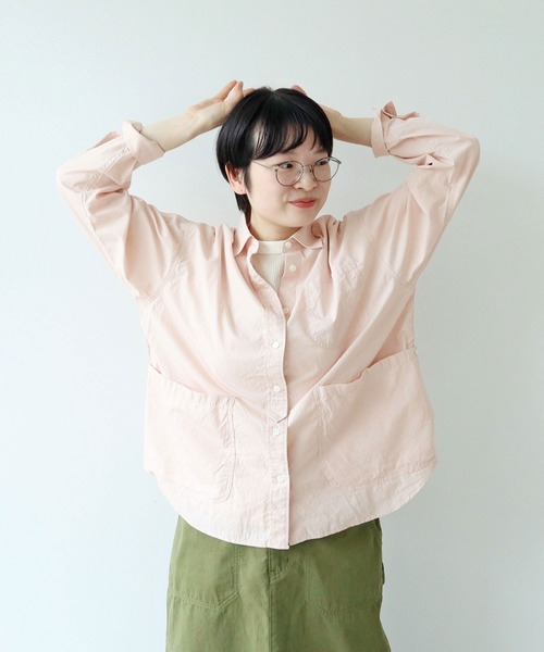 軽やかなカラーが春らしいガーデンシャツ。 着こなしに取り入れやすいニュアンスカラーのピンクと細かいブルーのギンガムチェックをチョイスし、女性が着やすい程良くメンズライクなアイテムに仕上げました。ピンクの生地にはナチュラルなシワ感を生み出すワッシャー加工を施し、洗いざらしたようなやわらかい雰囲気に。 園芸のガーデンシャツをベースに、ペン差しステッチを施した胸ポケットや、コバステッチなどのブランドらしいワークディテールの効いた一着。胸ポケット部分には配色のクロスカンヌキを入れ、遊び心が感じられるポイントをプラスしました。きりりとした印象の剣ボロ仕様の前立てでクラシックな印象に。庭いじりをする時に着るガーデンシャツは、土の入った袋やシャベルなどを入れるポケットが細かく区切られて付いていますが、こちらは普段使いしやすいようサイドに広い大きめのパッチポケットを付けました。ゆったりとしたシルエットで、ラフに羽織るだけでもこなれた着こなしが叶います。ディテールが映えるアイテムなので、チノパンツやデニムなど王道のシンプルなボトムとのスタイリングがおすすめ。 -------------------- 透け感:なし 裏地:なし 伸縮性:なし 光沢感:なし ポケット:あり -------------------- 【素材の特性・お取り扱いの注意】 ・取り扱いの注意については取り扱い表示をよくご確認の上、着用をお願い致します。 ・風合いとデザイン性を重視した天然貝ボタンを使用しています。天然素材の為個体差があり、衝撃などにより割れや欠けが生じることがありますのでご注意下さい。 ・(ピンク)自然なしわや風合いを出す為にワッシャー加工を施しています。アイロンやスチームをかけると風合いが消えてしまいますので、アイロンはできる限り避け、縫い代を浮かしスチームで軽く押さえる程度の仕上げにして下さい。 ・(ブルー系その他)汗や雨等で濡れた場合、摩擦などにより色落ちし、他の衣料に移染することがありますのでご注意下さい。 ※撮影画像は、光の当たり具合やモニターの環境により色味が違って見える場合があります。あらかじめご了承下さい。 ※ピンクの画像はサンプルを着用しています。お届けする実際の商品と仕様、加工、サイズが若干異なる場合があります。 サンプルの画像から脇丈が2.5cm長くなり、緩やかな前後差になります。